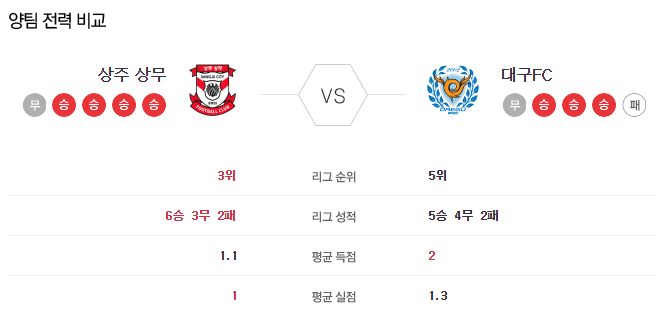 상주(3위, 승승승무무)는 주중 FA컵에서 포항 상대로 연장 승부 끝에 2-3으로 패배했습니다. 비록 경기에는 패했지만 다행히도 핵심 자원 대부분이 휴식을 취했습니다. 그래서 기존의 끈끈한 경기력을 볼 수 있어보입니다. 하지만 상대가 대구인 만큼 신중한 운영으로 이번 라운드에서 승점을 노릴 것으로 보입니다. 박용우를 중심으로 한 중원의 수비 기여, 권경원을 중심으로 한 수비진이 시도하는 압박 강도는 리그에서 훌륭한 수준입니다. 지난 리그 일정(vs 인천)에서 5회의 슈팅 허용에 그쳤습니다. 최근 득점력 반감 문제를 안고 있는 대구 상대로 효과적 대응이 가능할 것으로 보입니다. 다만 역습을 주도하는 ‘강상우, 김보섭’ 측면 공격의 속도, 전개 완성도가 떨어지는 점은 아쉽습니다. 최전방 공격수인 오세훈(FW)은 최근 5번의 리그 경기에서 1득점 기록에 그쳤다. 대체 자원이 마땅하지 않아 득점력을 올리는 것이 관건입니다.