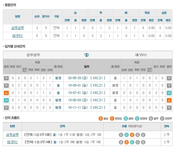 ▷상주 홈 성적 : 5전 4승 1패 (홈 무실점 80%, 홈 무득점 0%)