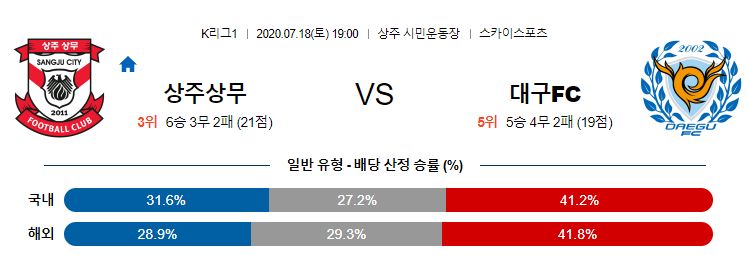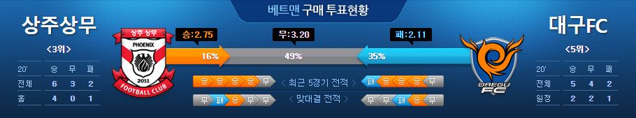 대구는 팀특유의 색깔을 살려 원정임에도 상대적으로 적극적 운영을 시도할 것입니다. 공격 전개를 주도하는 선수들이 피로감을 이겨내고 영향력을 발휘할 수 있을지가 관건입니다. 최근 일정에서 주전 공격수 에드가의 부상과 부분 전술 완성도가 떨어져 기회 창출 빈도가 감소했습니다. 중원과 수비의 압박이 좋은 상주 상대로 득점을 기대하기 어렵습니다. 다만 상주 역시 역습을 활용한 기회 생산이 만족스럽지 않고 최전방 공격수의 득점이 살아나고 있지 않는 문제가 있습니다. 두 팀 모두 이번 라운드 득점이 쉽지 않아 보입니다. 승점을 나눠가질 가능성이 가장 높아보입니다.