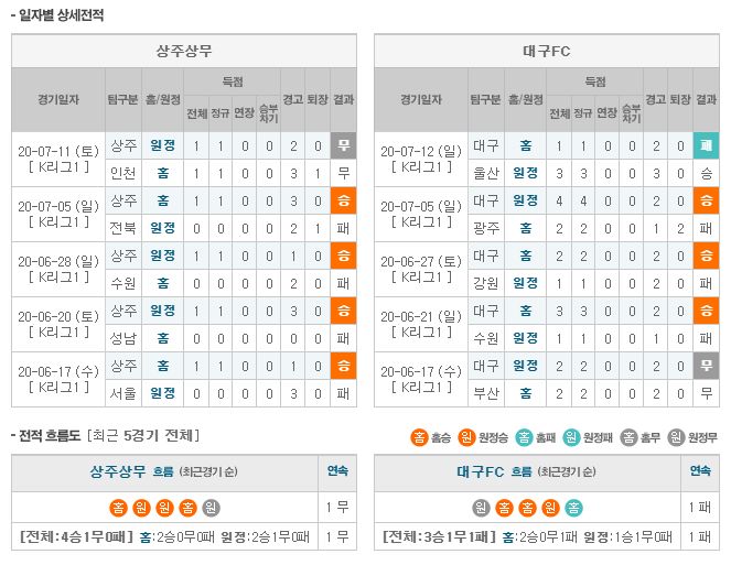 ▷상주 홈 성적 : 5전 4승 1패 (홈 무실점 80%, 홈 무득점 0%)