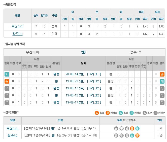 ▷최근 6경기 맞대결 : 6전 1승 4무 1패 9득점 10실점 (동률, 부산 기준)