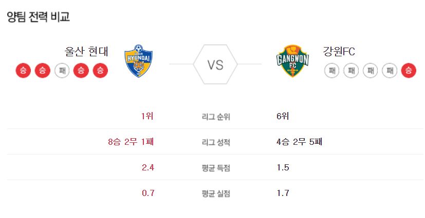 울산(1위, 승패승승승)은 최근 경기에서 다시 상승세를 타고 있습니다. 주중에 열린 FA컵에서 경주 한수원 상대 2-0 승리를 기록했습니다. 리그 포함 3연승을 달리고 있습니다. 주중 FA컵에서 주요 선수에게 충분한 휴식을 부여했습니다. 두터운 선수층이 빡빡한 일정을 소화하는데 안정감을 주고 있습니다. 연승을 기록하는 동안 멀티 득점을 반복했습니다. ‘김인성, 이청용’ 측면과 중앙 조합을 활용한 찬스를 생산하고, 윤빛가람을 통한 중원의 부분 전술 완성도 유지, 절정의 득점감각을 보여주는 주니오(FW, 리그 14득점 2도움) 결정력이 돋보입니다. 리그 1위팀 답게 강원을 공략하는데 어려움은 없을 것으로 예상됩니다.