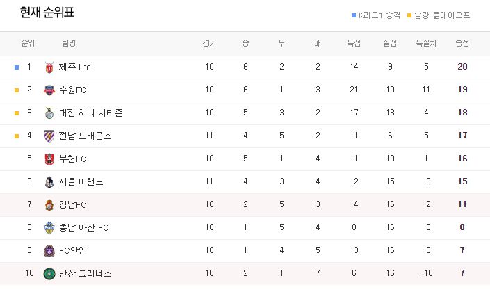 ▷안산, 리그 10경기 2승 1무 7패 / 평균 0.6득점, 1.6실점