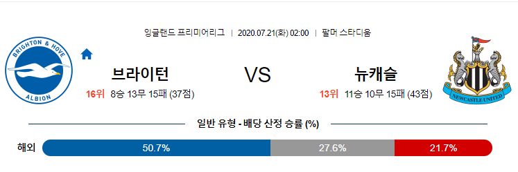 브라이튼은 리그 재개 이후 7경기에서 2승 2무 3패로 나쁘지않은 흐름을 보여주고 있습니다. 라인을 내려 버티다가 역습 또는 세트피스로 한 방을 노리는 전략이 좋은 모습을 보이며 승점을 얻고 있습니다. 뉴캐슬 또한 리그 재개 이후 나쁘지않은 경기력을 보였지만, 수비 불안으로 인해 최근 실점이 많아지며 3연패를 허용했습니다. 클락, 라셀레스, 셰어 등 센터백 자원들이 모두 부상당하며 견고한 수비진이 무너졌다는 점이 최근의 하락세의 원인입니다. 역습의 선봉장 역할을 했던 앨런 세이트, 막시맹 마저 부상당하며 이번 경기 결장할 가능성이 높습니다. 이번 대결에서는 브라이튼이 세트피스를 활용한 득점옵션이 매우 유용할 경기로 예상되며, 득점력이 저조한 브라이튼도 이번 경기만큼은 전력누수가 많은 뉴캐슬을 상대로 멀티득점을 노려볼 수 있을 것으로 예상됩니다.