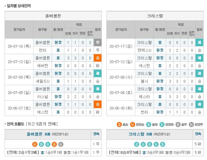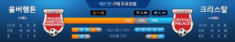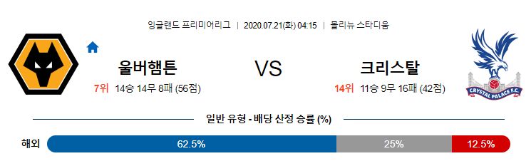울버햄튼은 선제실점을 허용하더라도 이를 추격하는 힘이 매우 좋은 팀. 주전 자원들이 모두 복귀한 풀전력의 울버햄튼은 재개 이후 3경기에서 웨스트햄과 본머스, 애스턴빌라를 차례대로 잡아내는데 성공습니다. 다만, 공격전개 과정이 꽤 단조로운 편으로 때문에 약팀을 몰아부치는 힘은 부족한 편입니다. 크리스탈팰리스는 최근 수비가 붕괴되고, 자신들의 득점루트가 너무 적어 어려움을 겪고있습다. 최근 6경기에서 2득점에 불과했고, 실점 이후 빠르게 동점을 만들어내는 힘 역시 약해졌습니다. 울버햄튼이 하위팀을 몰아부치는 힘은 부족하지만 현재 크리스탈팰리스는 너무 쉽게 실점을 허용하고 있기 때문에 울버햄튼이 크리스탈 팰리스를 몰아부치는 그림이 그려집니다.
