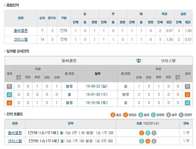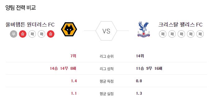 ▷울버햄튼, 홈에서 7승 7무 4패 / 평균 1.4득점, 1.1실점