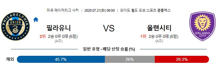 이번 경기는 중립구장인 ESPN 와이드월드오브스포츠 컴플렉스에서 열리는 토너먼트 조별예선입니다. 필라델피아는 앞선 리그 2경기에서 1무 1패로 아직까지 승리가 없지만, 토너먼트 두 경기에서는 뉴욕시티, 인터마이애미를 잡고 2승을 기록중입니다. 올랜도는 주전 스트라이커 돔 드와이어가 이번 대회를 통해 복귀했고, 인터마이애미와의 첫 경기에서 2:1로 기본 좋은 역전승을 했습니다. 1:1로 팽팽하던 승부는 종료직전 나니의 득점으로 갈렸습니다. 2경기에서 뉴욕시티 상대로도 3-1로 자신들의 공격력을 과시하며 여유있게 승리했습니다. 사실상 대회를 통한 올랜도의 기세가 꽤나 매섭습니다. 양팀 모두 2승으로 다음라운드 진출을 확정지은 상황에서의 순위 결정전이라 할 수 있습니다. 올랜도가 나니와 뮐러의 측면공격에서 큰 효과를 보고있지만, 필라델피아와 같이 미드필더와 수비의 균형이 잘 잡힌 팀을 상대로는 멀티득점이 쉽지않아보입니다. 오히려, 몰아부치는 올랜도의 2~3선 사이 벌어진 공간을 필라델피아가 활용하며 득점을 만들어낼 수 있을 것입니다.