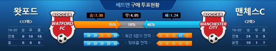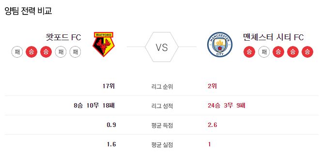 왓포드는 현재 리그 17위에 위치해 있으며 이전 경기에서 웨스트햄에게 3:1로 패배를 하면서 3연승에 실패했습니다. 강등권인 아스톤 빌라에 승점 3점을 앞서고 있습니다 . 현재 남은 리그경기 2경기를 맨시티와 아스날을 상대해야합니다. 두 팀 모두에게 상대 전력에서 밀리고 있기 때문에 상당히 어려운 경기를 치를 것으로 예상됩니다. 현재는 강등권 순위에서 벗어나 있는 상황이지만 남은 2경기의 결과에 따라 강등권으로 떨어질 수 있는 가능성이 있기 때문에 최대한 패배를 피해야만 하고 승점을 가져와야 하는 상황입니다. 홈경기라는 이점이 있지만 강팀을 상대로 전력차를 극복하고 이변을 만들 수 있을지 의문입니다. 맨시티와 이전 맞대결 5경기에서 승리가 없기 때문에 자칫 강등권으로 밀려날 수 있는 가능성 때문에 왓포드 선수들은 높은 집중력을 가지고 경기에 임할 것으로 보입니다. 하지만 맨시티와 전력차를 극복하기는 쉽지 않아 보입니다.