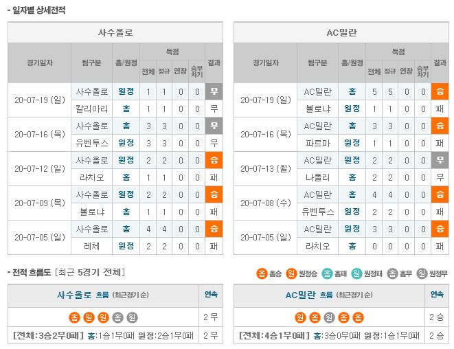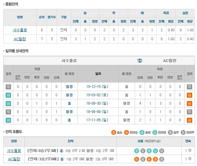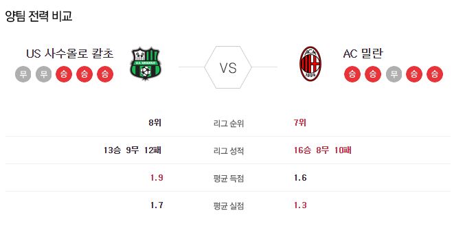 ▶사수올로 vs AC밀란 5경기 전적 2무 3패(사수올로 홈 2패)