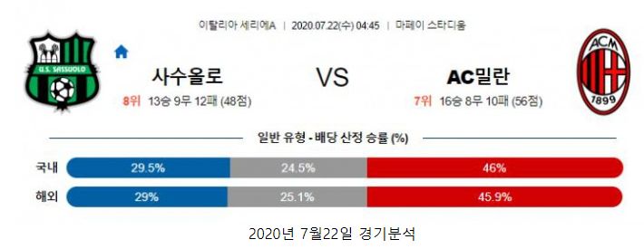 최근 세리에A 아틀란타와 함께 닥공의 사수올로. 최근 8경기 4승4무로 리그 재개 후 경기력이 대단합니다. 원정에 나서는 AC밀란 역시 최근 8경기 동안 25골을 득점할 만큼 공격력이 폭발하고 있는 모습입니다. 두 팀이 세리에A에서 리그 재개 후 경기력이 가장 좋은 편에 속하기 때문에 어느팀이든 선제골이 일찍 터진다면 난타전 가능성이 높을 것입니다.