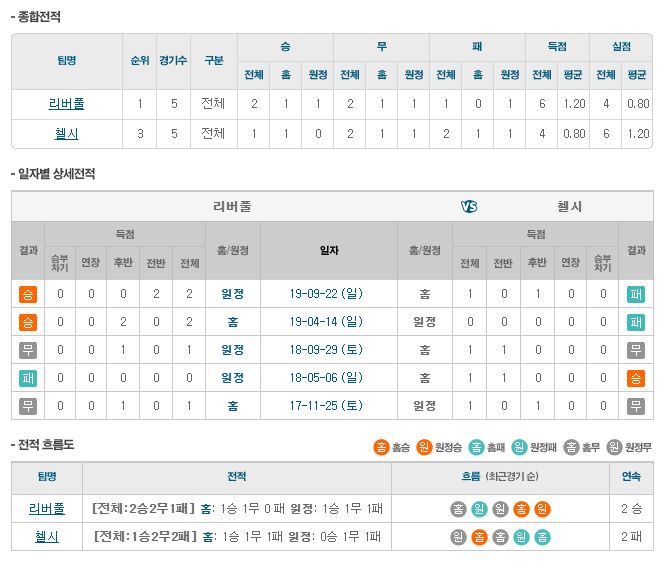 ▶ 리버풀 vs 첼시 5경기 전적 2승 2무 1패( 홈 1승 1무 )