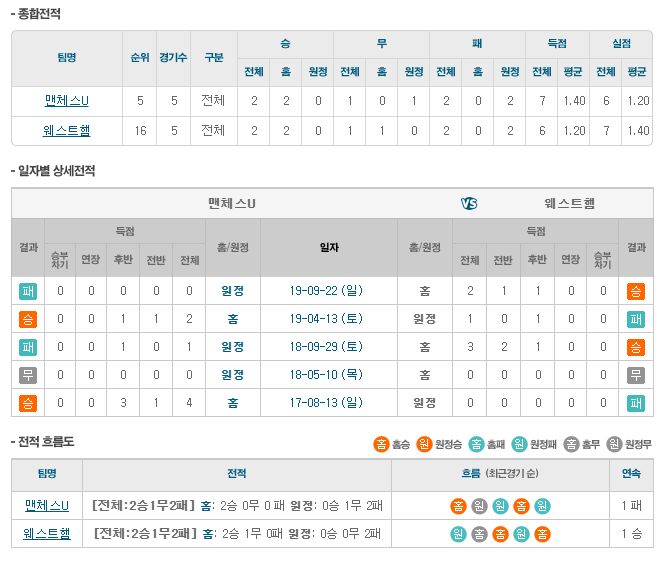 ▶맨유 vs 웨스트햄 5경기 전적 2승 1무 2패(맨유 홈 2승)