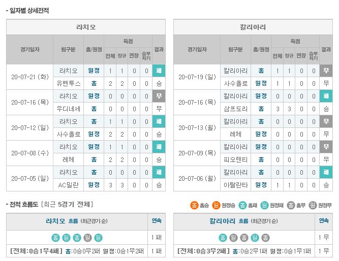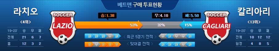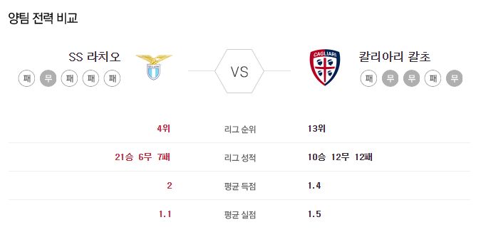 ▶라치오 vs 칼리아리 5경기 전적 4승 1무(라치오 홈 2승)