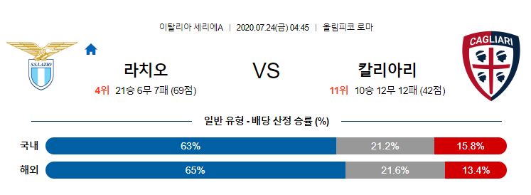 라치오는 이번 상대팀인 칼리아리를 상대로 최근 11경기 9승2무로 압도적인 성적을 기록하고 있습니다. 하지만 현재 라치오가 부상자 속출로 전력누수가 가볍지 않고, 리그 재개 후 그리고 최근의 경기력을 고려하고 상대전적에서 열세인 칼리아리는 최근 공격진의 부진으로 6경기째 승리를 기록하지 못하고 있지만 4무2패로 끈끈한 수비 조직력을 앞세워 쉽게 무너지지 않고 있는 칼리아리의 최근 흐름을 고려하면 무승부의 가능성이 가장 높아보입니다.