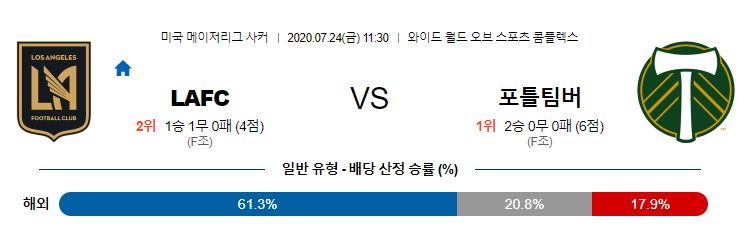 라이벌 LA 갤럭시를 6-2로 대파한 LA FC는 주전 공격수 벨라의 공백에도 2경기 9골을 넣는 놀라운 공격력을 보이고 있습니다. 하지만 이에 반해 2경기 5실점으로 수비진이 불안해 보입니다. 2연승으로 조1위를 달리고 있는 포틀랜드는 공수 밸런스는 LA FC가 이전에 상대했던 팀들과는 차이가 있기때문에 비기기만 해도 조 1위를 할 수 있는 포틀랜드의 실리 운영에 LA FC가 고전할 가능성이 높아 보입니다.