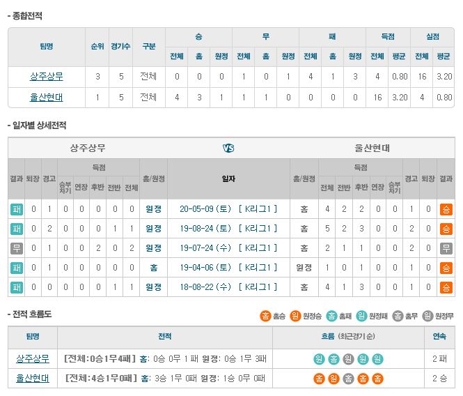 ▶상주상무 vs 울산현대 5경기 전적 1무 4패(상주상무 홈 1패)