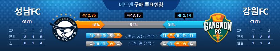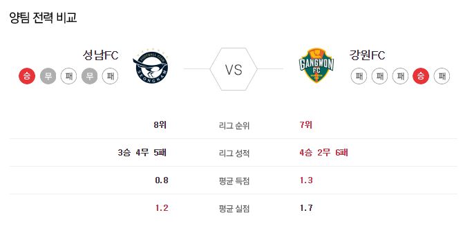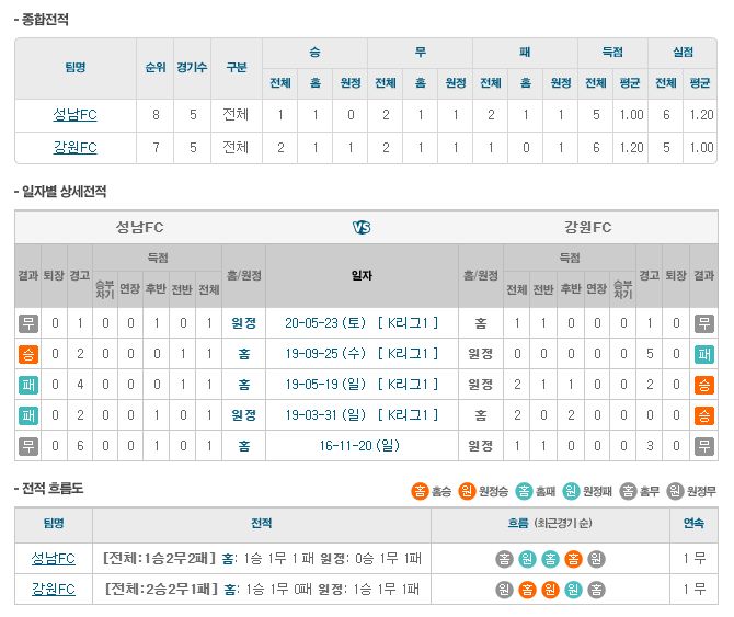 ▶성남 vs 강원 5경기 전적 1승 2무 2패(성남 홈 1승 1무 1패)
