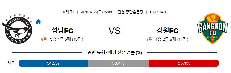 성남이 수원전 승리로 분위기를 반전하는데 성공하며 시즌 초반의 끈끈한 모습을 보여줄지 기대 됩니다. 그리고 지난 강원과의 시즌 첫 맞대결에서는 성남이 오히려 점유율 갖고 경기를 할 정도로 강원 상대로 좋은 경기력을 보여줬습니다. 강원이 이번 시즌 원정에서 1승1무4패로 매우 부진하고 홈팀 성남이 지난 수원전 승리의 분위기를 홈에서 강원을 상대로도 이어갈 수 있을 것으로 예상합니다.