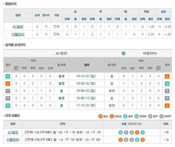 ▶AC밀란 vs 아탈란타 5경기 전적 1승 2무 2패(AC밀란 홈 1무 1패)