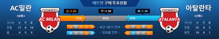 AC밀란 원정에 나서는 아탈란타는 지난 라운드에서 인터밀란이 비기고 자신들은 볼로냐와의 홈경기에서 승리하면서 승점 74점을 획득하여 리그 2위로 올라서는데 성공했습니다. 사실상 선두 유벤투스를 따라가기엔 불가능 할 것으로 보이지만 리그 2위로 시즌을 마칠 수 있는 기회로도 팀과 선수들의 동기부여는 충분할 것입니다. 공격에 비해 불안했던 수비도 리그 재개 후 10경기 25득점 10실점으로 수비진도 시즌 막바지에 점차 안정을 찾아가고 있습니다. 미드필더 카스타네가 출전정지로 인해 결장하는 것 외에 특별한 전력손실이 없습니다. 공격수 일리치치가 재개 후 폼을 찾지 못하고 있는 점이 아쉬운 부분이지만 팀의 에이스 고메즈를 중심으로 사파타, 무리엘 같은 공격수들은 물론 파살리치, 말리노프스키 등 미드필더 선수들의 득점력이 보탬이 상대팀에게 부담을 주고 있습니다.