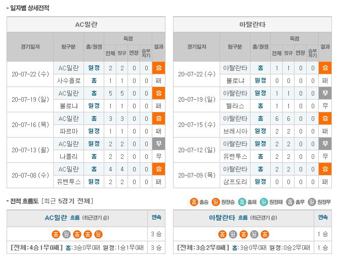 리그 재개 후 세리에A에서 가장 좋은 경기력을 보여주고있는 두 팀이 만났습니다. 코로나 19로 인한 리그 중단 이후 사실상 세리에A 최고의 팀을 가리는 경기라 할 수 있습니다. 다만 AC밀란이 아탈란타전을 앞두고 수비진의 핵심들이 대거 결장하여 100% 전력을 구축하는 못하는 점이 아쉽습니다. 아탈란타가 최근 리그 최고의 공격력을 보여주고 있는 닥공의 팀이라는 점이기 때문에 AC밀란의 전력손실이 아탈란타쪽으로 승리의 무게추가 기울 것으로 보입니다.