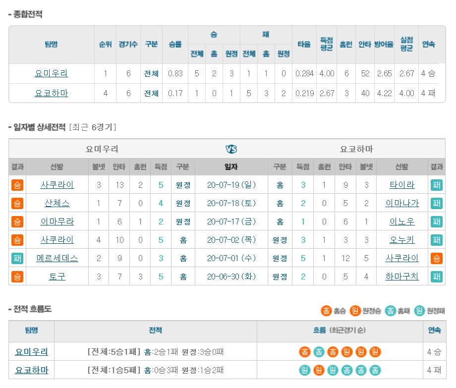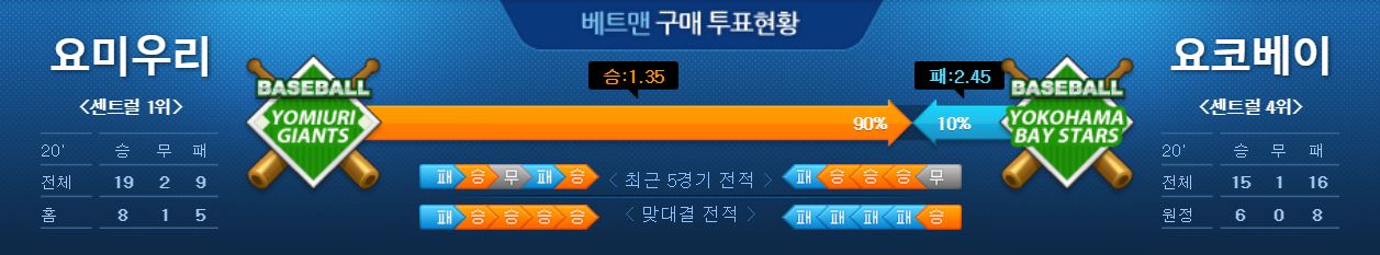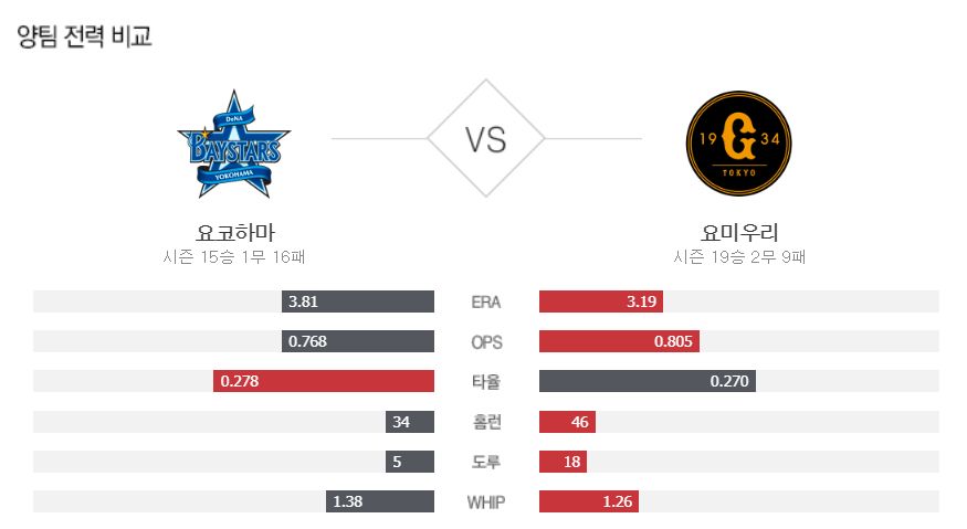 요미우리는 지난 일요일 야쿠르트 원정에서 9-4 승리를 기록하며 시리즈 1승1무1패를 기록했습니다. 올시즌 성적은 19승2무9패로 막강한 투수력을 앞세워 2위 야쿠르트에게 3.5게임차 앞선 1위를 달리고 있으며 요미우리는 팀 평균자책점 1위를 기록하고 있습니다. 반면, 원정팀 요코베이는 일요일 히로카프를 상대한 홈경기에서 6-10 패배 기록하며 시리즈 2승1패를 기록했습니다. 특히 이 날 경기는 팀 3연승 실패와 동시에 6-0의 리드를 지키지 못하고 8, 9회 상대에게 10점을 실점하며 패하고 말았습니다. 올시즌 현재 5할 승률에 1승 부족한 15승1무16패를 기록하고 있습니다. 23이닝 무실점 행진을 하고 있는 스가노 토모유키 투수가 선발 싸움에서 우위에 있고 타선의 응집력에서도 요미우리가 요코베이에 앞서 있다고 할 수 있습니다.