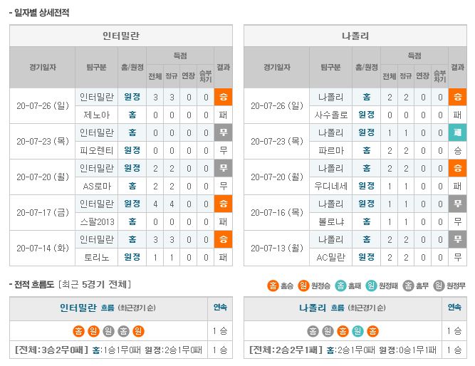 ▶인터밀란 vs 나폴리 5경기 전적 2승 2무 1패(인터밀란 홈 1승 1무)