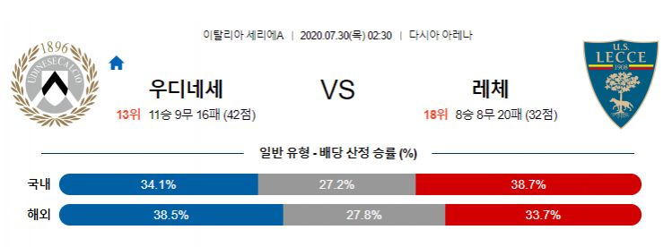 우디네세는 최근 2경기에서 유벤투스와 칼리아리에 승리를 하며 2연승 중입니다. 시즌 종료를 앞둔 최근의 경기력이 상당히 좋습니다. 이미 리그 우승을 확정 지었지만 리그 1위 유벤투스를 상대로 승리를 한 점은 굉장히 고무적이라 할 수 있습니다. 특히 미드필드 라인에서 경기운영 능력이 준수하며, 역습 상황에서 공격수 라자냐의 라인 브레이킹이 상대를 괴롭히고 있습니다. 원정팀 레체는 리그 잔류를 위한 승리를 위해 최근 공격적으로 나서고 있는데 높은 수비 라인이 상대의 뒷공간을 잘 공략하고 있는 우디네세 공격수 라자냐의 좋은 먹잇감이 될 것으로 예상됩니다. 레체가 만약 라인을 올려 우디네세에게 맞불을 놓고 우디네세의 선취골이 쉽게 나온다면 이번 경기에서도 대량 실점과 함께 무너질 것으로 보입니다.