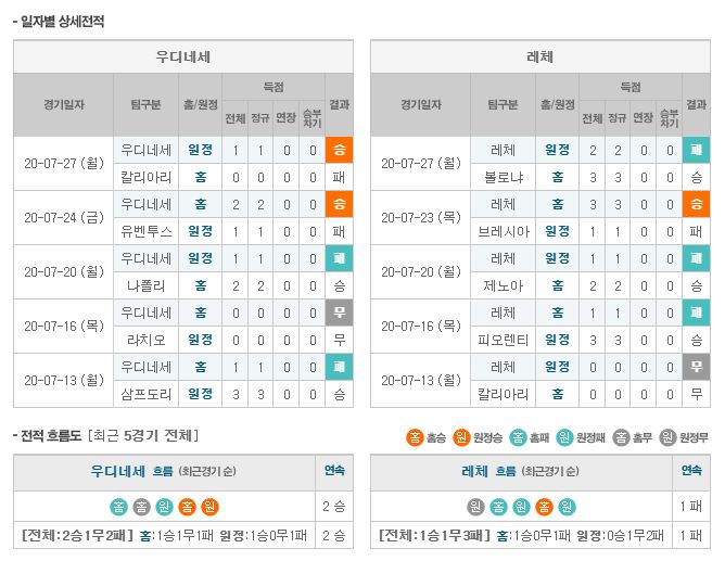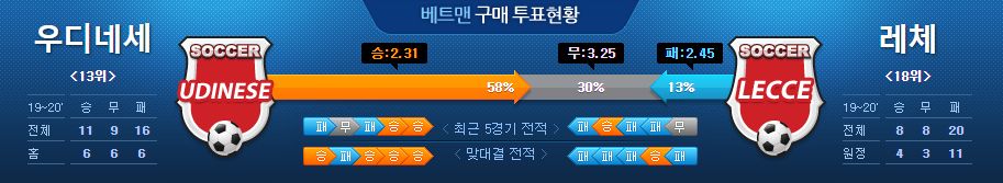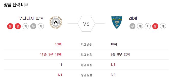 ▷우디네세, 레체 상대로 3연승 중