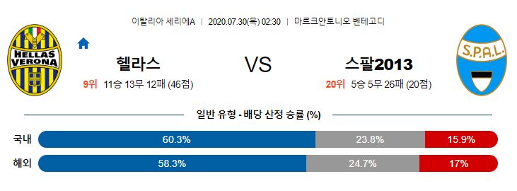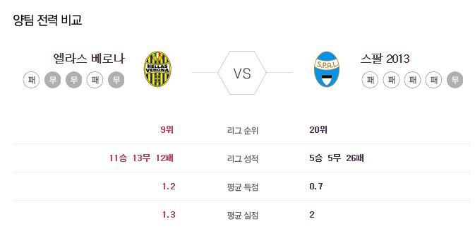 이번 경기는 홈 팀인 헬라스 베로나의 승리하는 그림이 그려질 수 밖에 없어보입니다. 스팔2013의 최근 경기력을 보면 도무지 승점을 기대할 만한 상태가 아닙니다. 스팔이 홈팀 배로나를 상대로 이번 경기에서 대량 실점을 허용하지 않고 패배만 해도 선전했다고 할 수 있다고 보입니다. 헬라스 베로나의 선취골이 이른시간 터진다면 대량 득점을 터뜨리는 경기가 될 것이 예상됩니다.
