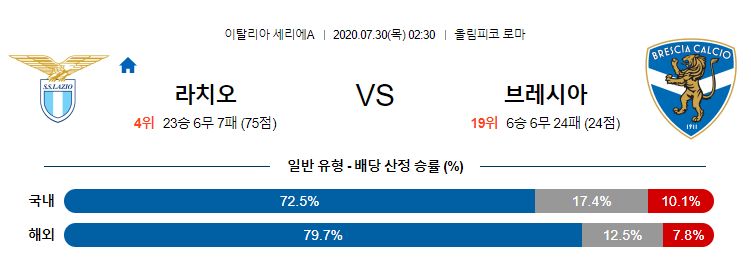 최근 공격력이 살아나고 있는 라치오가 이미 강등을 확정지은 브레시아를 상대로 대승을 예상할 수 밖에 없는 경기입니다. 양 팀 간의 통산 맞대결 전적이나 최근 경기력 차이가 너무도 크기 때문입니다. 라치오가 득점력이 지난 경기를 통해서 회복됐기 때문에 이미 강등이 확정된 팀을 상대로 이번 시즌 마지막 홈 경기에서 다득점의 승리가 예상됩니다.