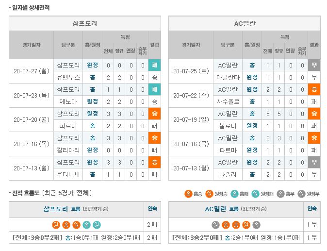 ▷삼프도리아, AC 밀란 상대로 최근 3경기 1승 2무 기록