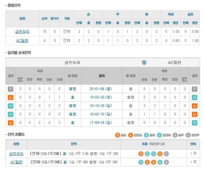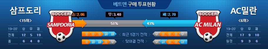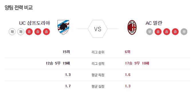 ▷삼프도리아, AC 밀란 상대로 최근 3경기 1승 2무 기록