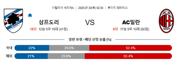 이번 경기는 최근 경기력이 절정에 이른 AC 밀란의 승리가 그려집니다. 삼프도리아도 나름 준수한 공격력을 기반으로 거센 저항에 나설 것으로 보이지만, AC 밀란의 최근의 기세에 저항하기에는 어려울 것으로 보입니다. 양 팀 모두 득점 기대치가 높기 때문에 다득점의 경기가 예상 됩니다.