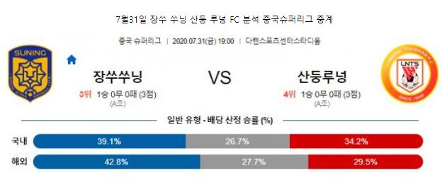 장쑤쑤닝은 지난 시즌 수비수 미란다의 영입이후 13경기 무패를 기록하며 상승세를 만들었습니다. 올시즌 1라운드에서 허난에게 꽤 많은 실점을 했습니다. 하지만 4:3으로 결국 승리를 하였습니다. 산둥은 원정 경기에서 탄탄한 조직력으로 승리를 했습니다. 타마스 카다르의 영입으로 수비가 보강된 점이 눈이 띕니다. 하지만 윙사이드 공격의 핵심선수인 로저 괴데스가 아직까지 팀에 합류하지 못한 점이 아쉽습니다. 이번 경기는 용호상박의 대결이라 할 수 있습니다. 두 팀다 공수밸런스가 나쁘지 않은 팀이기 때문에 무승부의 가능성이 가장 높아 보입니다.