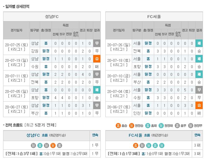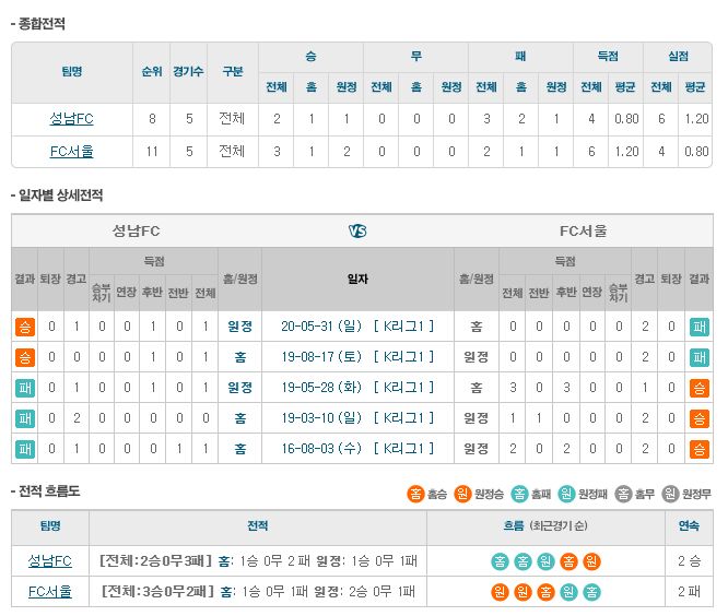 ▶성남FC vs FC서울 5경기 전적 2승 3패(성남FC 홈 1승 2패)
