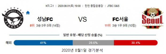 성남은 현재 리그 8위에 랭크되어 있습니다. 이전 경기에서 강원을 상대로 0:0 무승부를 기록하며 3경기에서 패배가 없습니다. 최근 홈경기에서 기복을 보이며 경기력에 흔들리는 모습을 보였지만 최근 수비가 안정화 되면 상대에게 쉽게 골을 허용하고 있지 않습니다. 이번 라운드 부터 유관중 전환을 앞두고 있는 상황에서 경기력이 좋은 상황에서 유관중 홈경기를 통한 홈 첫 승에 도전합니다. 팀 내에서 가장 많은 득점 포인트를 기록하고 있는 양동현이 최근 벤치를 지키는 시간이 많아 졌고 김현성과 나상호를 통해서 공격 라인에서 활발한 움직임을 보이고 있습니다. 서울과의 맞대결에서 2승 3패를 기록하며 경기력에 큰 차이가 없습니다. 더욱이 최용수 감독이 성적 저하를 이유로 자진 사퇴하고, 최근 서울의 경기력이 상당히 저하된 모습을 보이며 계속해서 상대에게 대패하고 있는 모습입니다. 따라서 성남이 견고한 수비를 바탕으로 유리한 경기 흐름을 가져올 수 있을 것으로 판단되며 이번 경기에서 홈팀 성남이 홈 첫승을 할 가능성이 매우 높아 보입니다.