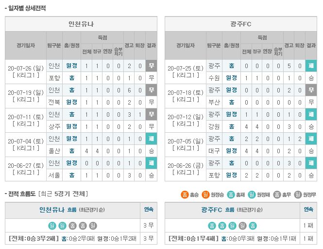 ▶인천 vs 광주 5경기 전적 1승 3무 1패(인천 홈 1승 2무)