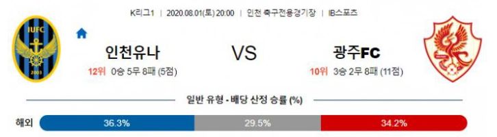 인천은 현재 리그 12위 최하위에 위치해 있습니다. 지난 라운드에서 포항 원정에서 1:1 무승부를 기록했지만 경기 막판 리그 3위팀을 몰아부치는 모습이 인상적이었습니다. 올 시즌 아직까지 승리를 하지 못하며 최하위에 머물러 있습니다. 공격력과 수비력이 다른 팀과 경쟁하기에 부족한 모습입니다. 공격을 이끌어야할 김호남의 기량이 정상적이지 않은 것이 가장 큰 이유라 할 수 있습니다. 여전히 호흡이 맞지 않은 측면으로 인해 공수 양면에서 상대팀의 타깃이 되고 있습니다. 다행히 광주 역시 최근 흐름이 좋지 않은 상황이기 때문에 최근 인천의 투지를 생각한다면 이번 경기를 통해서 시즌 첫 승이 가능 할 것으로 예상됩니다. 광주와 상대 전력에서 큰 차이를 보이고 있지 않고, 이전 5경기 맞대결에서 1승 3무 1패를 기록할 만큼 호각새를 보이고 있기 때문에 직전 포항과에 경기 처럼 선수들이 투지를 보여준다면 무승부 내지 승리가 가능할 것으로 예상됩니다.
