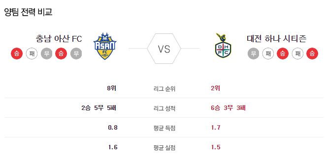 아산은 현재 리그 8위에 위치해 있습니다. 이전 경기에서 서울 E랜드 원정에서 2:1 승리를 가져왔습니다. 직전 경기에서 승리하긴 했지만 최근 10경기에서 여전히 불안정한 경기력을 보이고 있습니다. 홈경기에서도 실망스러운 경기력을 보이고 있는 상황이지만 전경기에서 퇴장 징계로 인해 라인업에서 제외됐던 박세직의 복귀는 팀에 제법 긍정적인 효과를 줄 것으로 보입니다. 이외에도 필립의 득점력이 올라오고 있고 김찬 역시 최근 골 맛을 보며 슬럼프에서 벗어났습니다. 이 처럼 공격 라인에서의 폼이 올라오고 있지만 상대를 리그에서 전력이 우수한 대전이기 때문에 이번 경기에서는 전력 차이를 극복하지 못하고 또 다시 패배를 할 가능성이 매우 높아 보입니다.