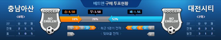 황선홍 감독이 이끄는 대전은 현재 리그 2위에 위치해 있습니다. 이전 경기에서 까다로운 상대였던 제주에 2:1로 승리를 가져왔습니다. 올 시즌 대전은 원정 경기에서도 좋은 경기력을 보이고 있는 상황입니다. 팀 내에서 가장 많은 득점을 올리고 있는 루이스가 꾸준히 득점을 기록하며 좋은 경기감각을 보이고 있고 브루노 역시 경기력이 올라오고 있는 모습입니다. 다만 박진섭이 최근 주춤하는 모습을 보여 측면에서의 움직임이 다소 밸런스가 무너지는 모습을 보이고 있습니다. 하지만 리그 최상급의 공격 라인과 안정감 있는 있는 수비를 홈팀 아산이 뚫어내기는 어려울 것으로 보입니다. 대전은 아산 원정이지만 이번 경기에서 승리를 가져올 수 있는 가능성이 높게 예상됩니다.
