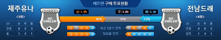 전남 또한 리그 초반 부진을 털고 어느덧 리그 4위까지 위치해 있습니다. 직전 경기 까다로운 상대인 경남을 상대로 1:1 무승부를 기록하며 4경기째 패배가 없습니다. 4경기 무패를 이어가고 있지만 올 시즌 원정에서는 다소 경기가 풀리지 않는 모습을 자주 보여주고 있습니다. 원정 10경기에서 3승 5무 2패로 나쁘지 않은 기록을 가지고 있지만, 잦은 무승부로 인해서 승점 1점을 획득하는데 그쳐 더 높은 순위로 올라서지 못하고 있습니다. 현재 공격 자원에서 폭발 해주는 선수가 없는 것이 문제입니다. 그렇기 때문에 공격 라인의 쥴리안, 이종호가 더욱 많은 움직임과 집중력으로으로 골 결정력을 높여주어야 합니다. 제주를 상대로 이전 경기에서 승리를 가져왔지만 최근 제주의 경기력이 매우 좋았던 점을 감안하면 최근 5경기에서 단 3실점만을 허용한 전남의 수비진이 더욱 집중이 필요한 경기입니다. 전남은 최근 4경기에서 패가 없지만 상대한 팀들이 상대적으로 전력이 약한 팀이었습니다. 그동안 전남의 수비진이 잘 해줬지만 최근 제주 원정에서 모두 패했기 때문에 이번 경기에서 전남이 승리하기는 쉽지 않아 보입니다.