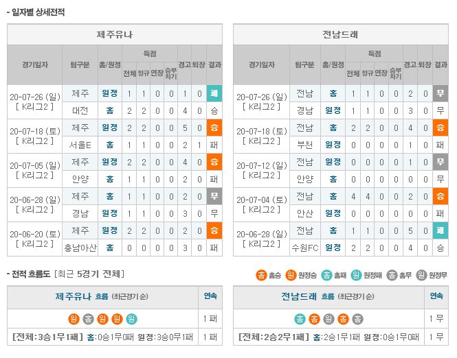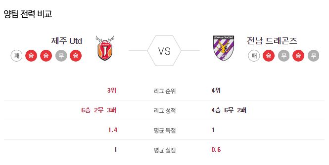 ▶제주 vs 전남 5경기 전적 4승 1패(제주 홈 3승)