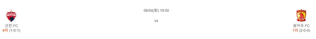 선전은 1라운드에서 푸리에 완승을 거뒀습니다. 완승이긴 하지만 상대의 자책골과 PK 2개가 겹친 득점이었기 때문에 좀 더 지켜볼 필요는 있어 보입니다. 특히, 새롭게 영입한 티에비 비푸마가 아직까지 출전할 수 없는 상태이기 때문에 광저우 에버그란데를 상대로 공격적인 부분에서 변수를 만들어내긴 어려운 상황입니다. 에버그란데는 올 시즌에도 삼각편대와 파울리뉴, 그리고 엘케손까지 더해지며 막강한 화력을 보이고있습니다.(올 시즌 2경기 7득점/0실점). 에버그란데는 선전 상대로 역대 8차례 맞대결에서 7승 1무로 압도적 우위를 점하고있습니다. 양팀의 전력차이를 감안했을 때 두 골 차 이상으로 벌어질 가능성이 높아 보입니다.