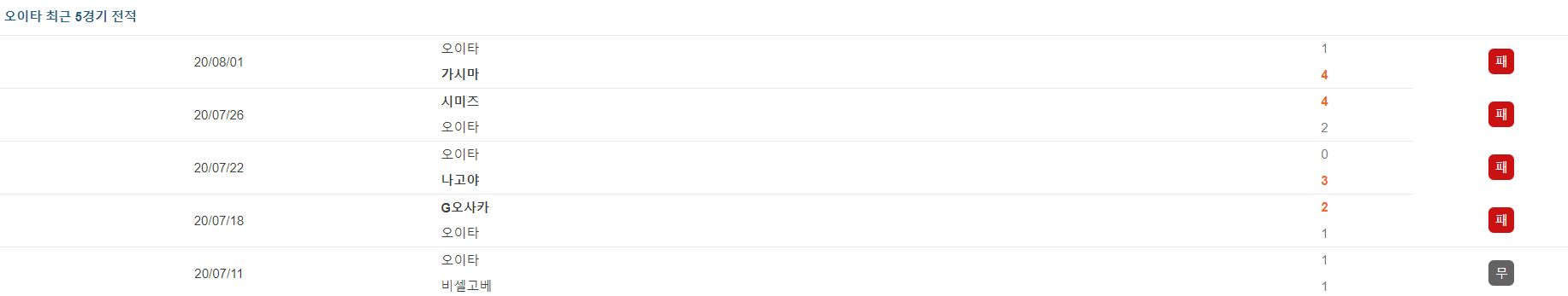 ▷오이타, 최근 4경기 4득점 13실점 기록
