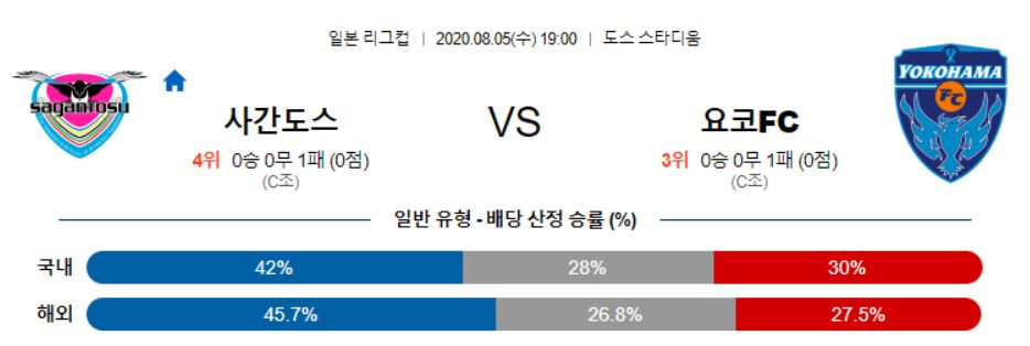 요코하마는 최근 5경기 1무 5패로 극심한 부진에 빠져있습니다. 그렇기 때문에 일본리그컵에 신경쓸 겨를이 없어 보입니다. 최근 홈팀 사간도스가 경기력을 회복하고 있기 때문에 최악의 부진을 겪고 있는 요코하마를 상대로 가볍게 승리할 것으로 예상됩니다.