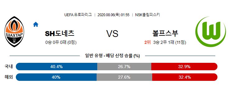 지난 3월에 볼프스부르크 홈에서 열린 1차전에서 2-1로 승리한 샤흐타르는 유리한 상황에서 2차전을 치릅니다. 홈에서 2골을 내준 볼프스부르크가 원정 다득점 원칙에 따라 이번 경기에서 최소한 2골 이상 넣고 승리해야 8강 진출이 가능한 상황이라는 점을 고려하면 홈에서 극강의 모습을 모여주는 샤흐타르의 날카로운 공격에 오히려 당할 가능성이 높아 보입니다.