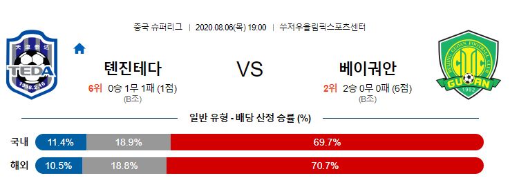 톈진은 팀의 공격을 이끌던 스트라이커 바그너가 갑작스럽게 팀을 이탈하며 이 공백을 채우기 위해 애쓰고있습니다. 1라운드에서 융하오가 1골 넣긴 했지만 역부족이었습니다. 조나탄이 복귀했던 직전 경기에서도 약체 충칭 상대로 간신히 무승부를 거두는데 만족하며 올 시즌 2경기에서 1무 1패의 저조한 성적을 기록하고 있습니다. 베이징은 지난 시즌 매우 강했던 전력에 페르난도를 완전영입하며 우승을 위한 밑그림을 완성했습니다. 지난 시즌 중반부터 활약해 경기당 1개 이상의 공격포인트를 기록한 바캄부 역시 건재합니다. 용병뿐만아니라 중국 국내 자원들의 경기력도 매우 좋은 편이기 때문에 베이징이 가진 밸런스라면 최근 수비에서 헛점을 보이고 있는 톈진 상대로 주도권을 갖고 경기를 할 것으로 예상됩니다.
