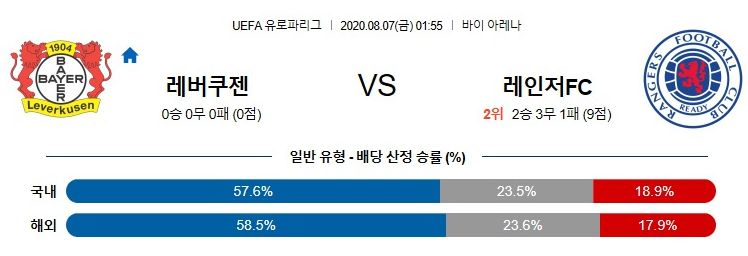 레버쿠젠은 1개월만에 공식경기를 치릅니다. 다행히 1차전 원정에서 3-1 대승을 안고 있는 홈에서 열리는 경기에 부담감이 적은 상황입니다. 레인저스는 다득점 승리를 노리려 라인을 올릴텐데 이 점을 레버쿠젠의 미드필더와 공격수들이 적절히 이용하면 공격력이 충분히 폭발할 수 있을 것으로 보입니다.