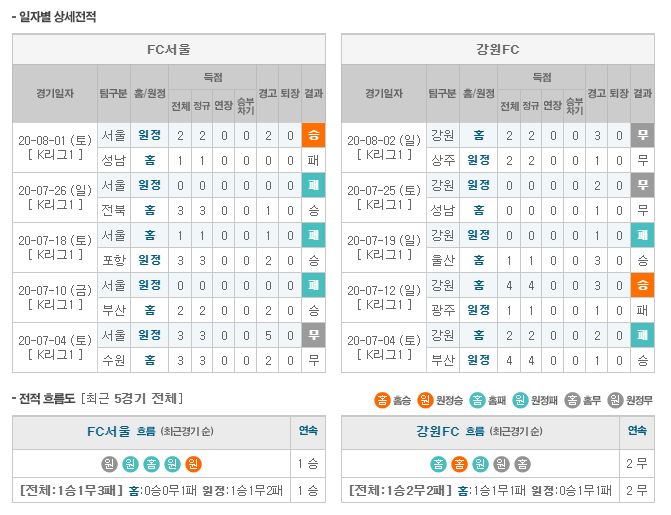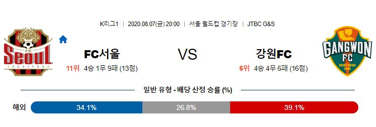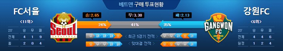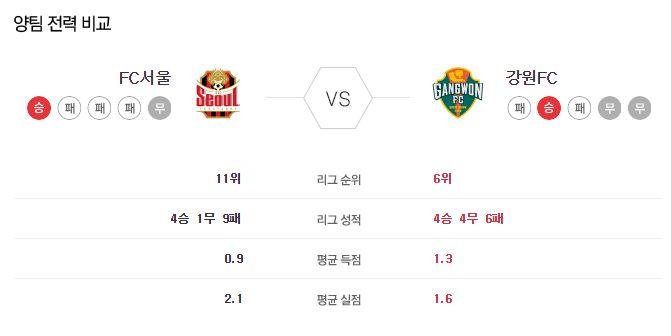 서울은 계속된 연패로 인해 최용수 감독이 사퇴했습니다. 다행히도 지난 성남과의 경기에서 오랜만에 리그에서 승리하며 반등을 이끌어 냈습니다. 하지만 수비조직력이 붕괴된 상황이며 지난 경기의 승리도 상대팀의 실수가 아니었다면 어려웠을 경기였습니다. 직전 라운드에서 성남 상대로 윤주태가 두 골을 넣으며 간신히 3연패로부터 탈출했지만, 경기력 자체는 매우 좋지않았고 실력이 아닌 운이 많이 따른 경기였기 때문에 큰 의미부여는 어렵습니다. 강원은 2선을 생략한 강력한 역습전개가 인상적인 팀입니다. 특히 공격수 고무열까지 연결되는 전개과정이 매우 좋은 편입니다. 최근 9경기 1승 3무 5패로 부진하고있지만, 경기력적인 부분에서는 나쁘지 않았습니다. 그렇기 때문에 강원의 공격전개가 통할 수 있는 팀을 상대로는 여전히 강한 모습을 보여줄 것입니다. 오스마르의 이탈로 중원의 강점이 사라진 서울을 상대로 강원이 원정에서도 충분히 많은 공격기회를 가져갈 수 있는 경기지만, 서울 역시 지난 경기를 통해 연패를 끊어냈기 때문에 강원의 헐거운 수비조직력을 여러차례 공략해낼 능력은 충분해 보입니. 서울에서의 강원과 최근 세 차례 맞대결 모두 무승부를 기록했습니다.